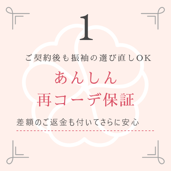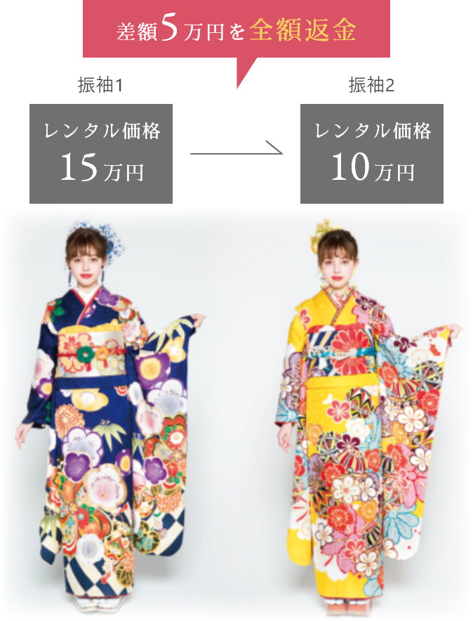 最初にお選びいただいたお振袖よりもお安いお振袖をお選びいただいた場合、差額のご返金保証もついてさらに安心!